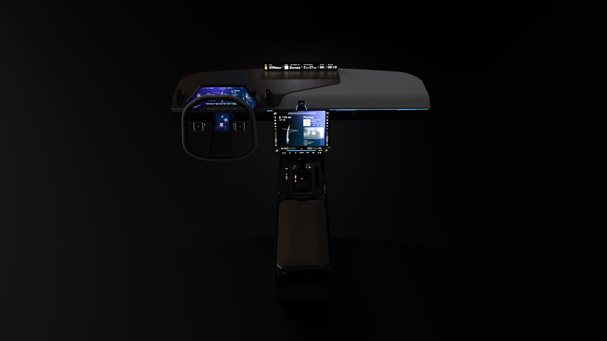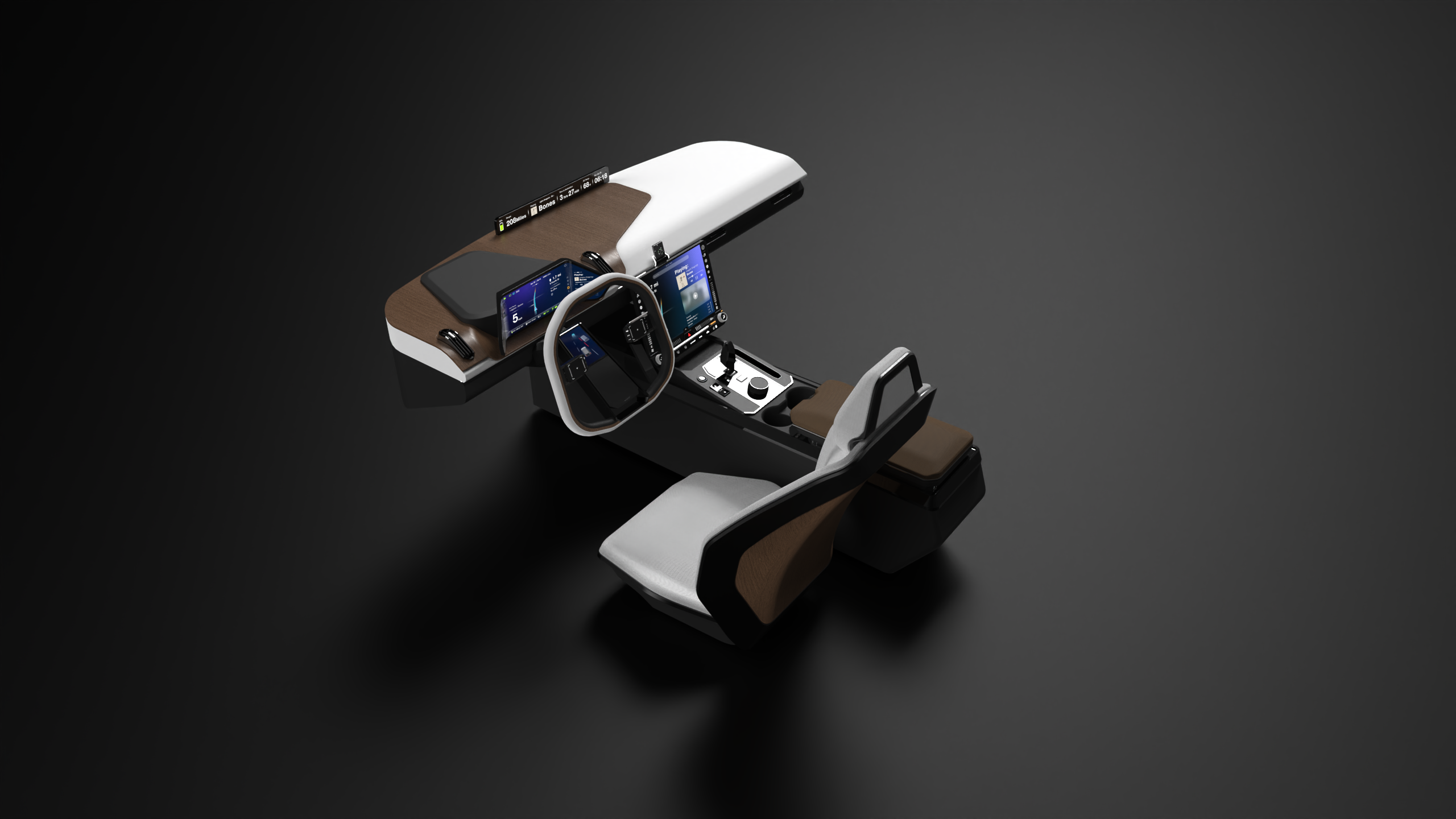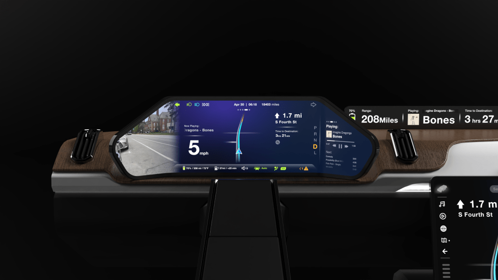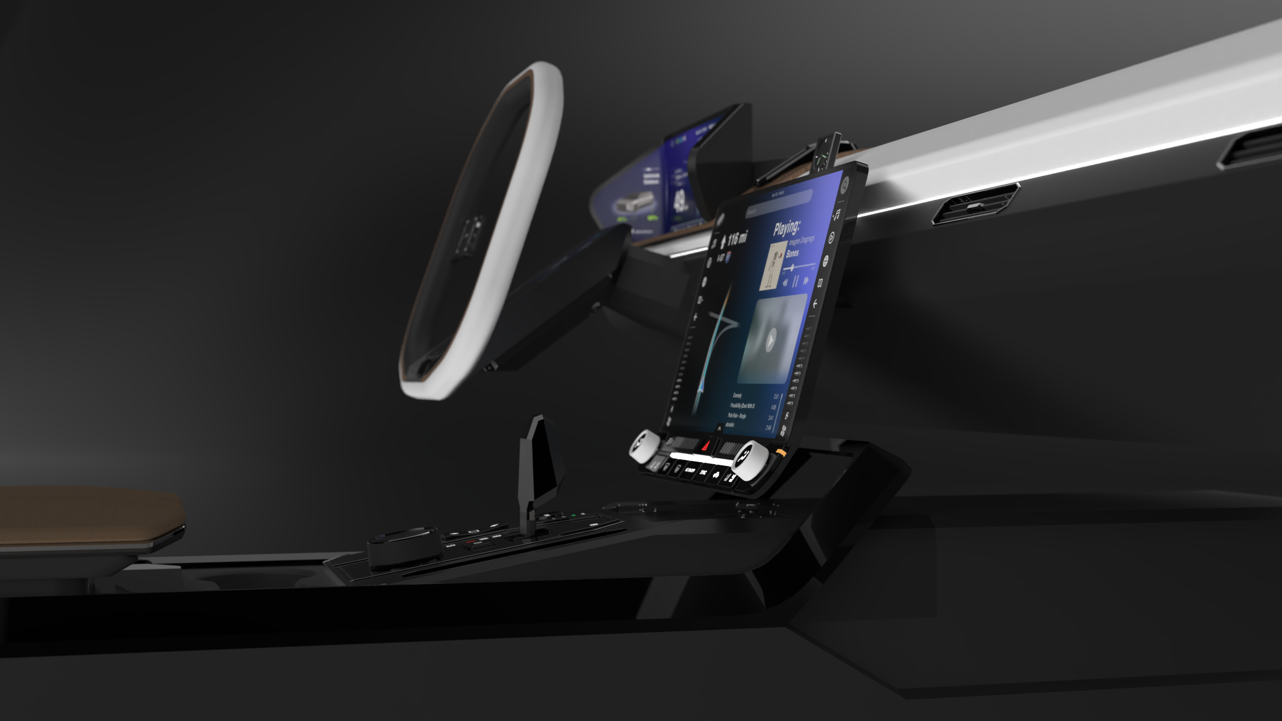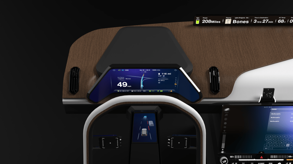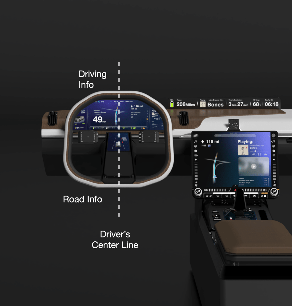 The dashboard is large and curved to maximize the display area. The curvature physically divides the screen into three parts. Derived from conventional dashboard, the curved design provides more space for information. Drivers can customize the category and density of the information. It also provides more natural perspective when viewing panoramic content.