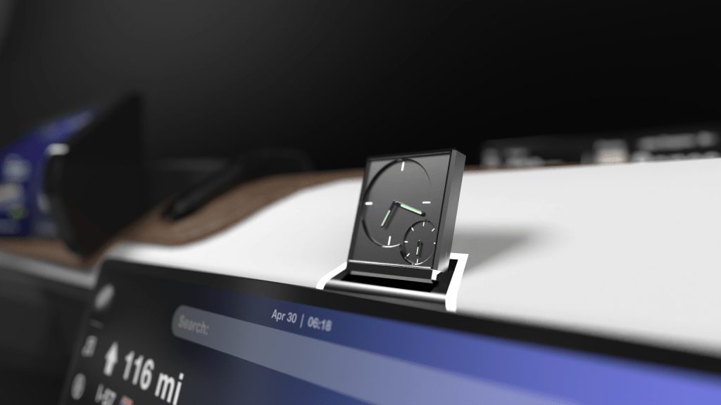 The clock shows the time, and exhibits the acceleration force (G force) though a secondary dial plate. Considering torque, or the acceleration, is one thing electric car hugely outperforms most gasoline car, showing the G force of the car adds excitement for driving enthusiasts.