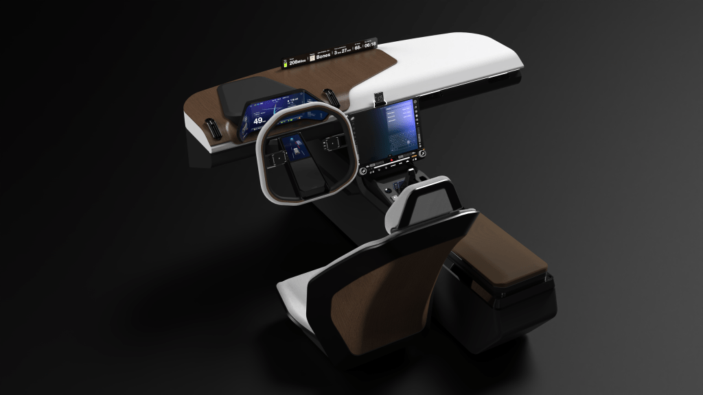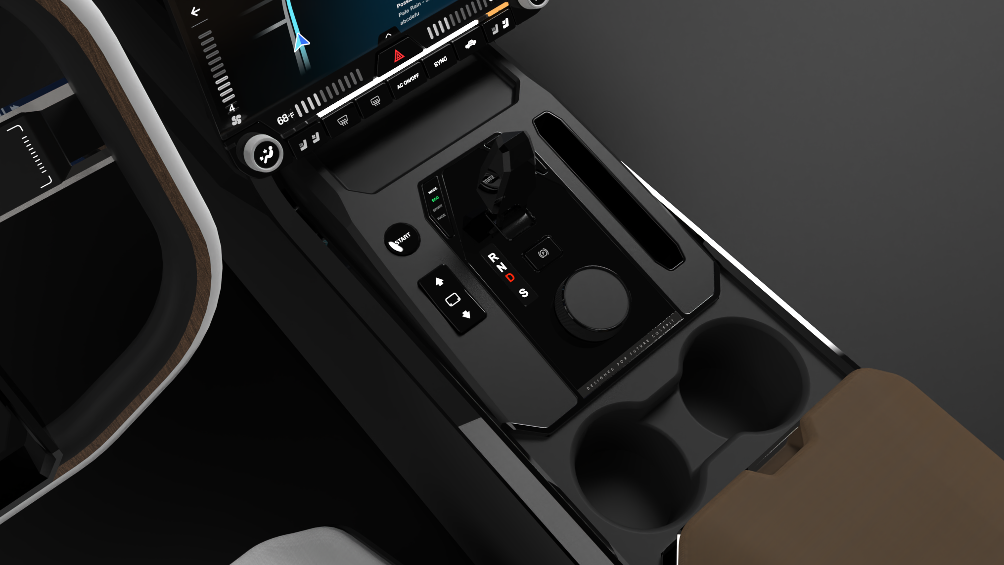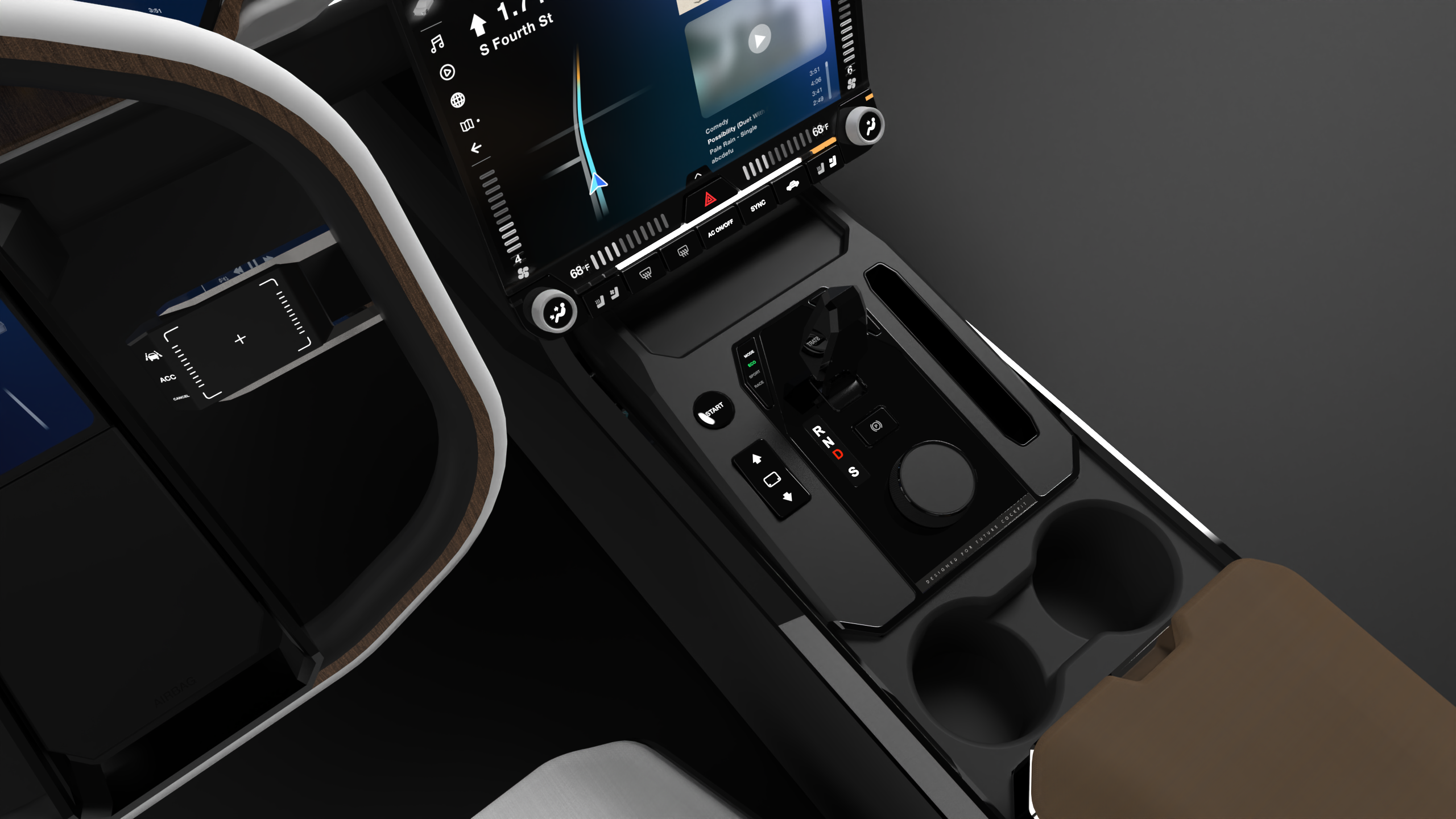 The vehicle control zone remains similar to conventional design: physical buttons, a gear shift stick, a dial-touchpad, and, of course, two cup holders.