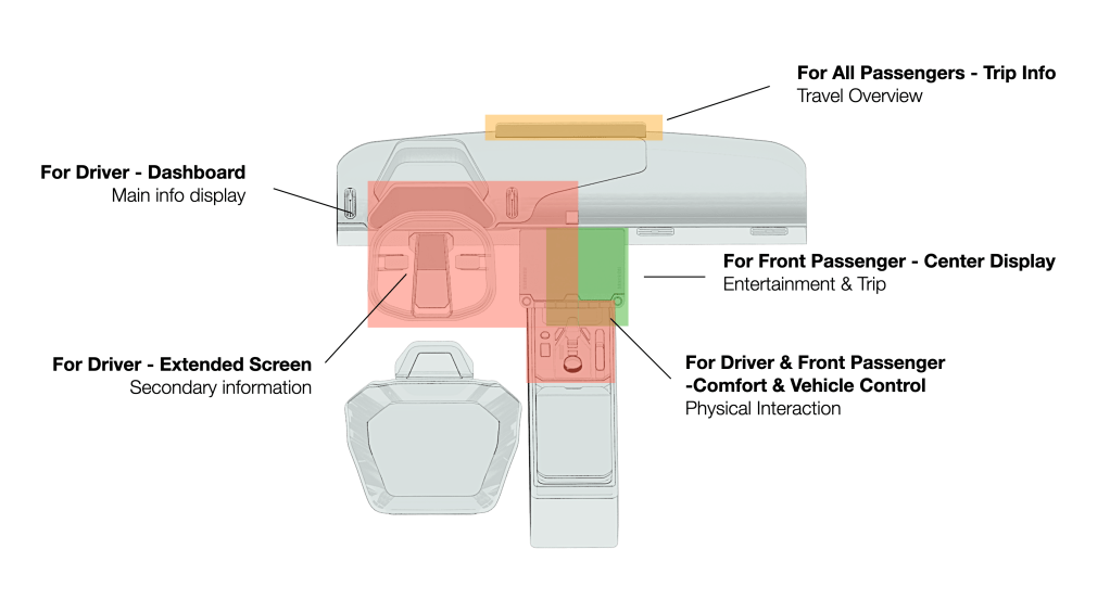 Besides the driver, front passenger usually functions as a co-pilot to input the complex commands such as searching on map or finding a song. The interface is for both the driver and the front passenger.