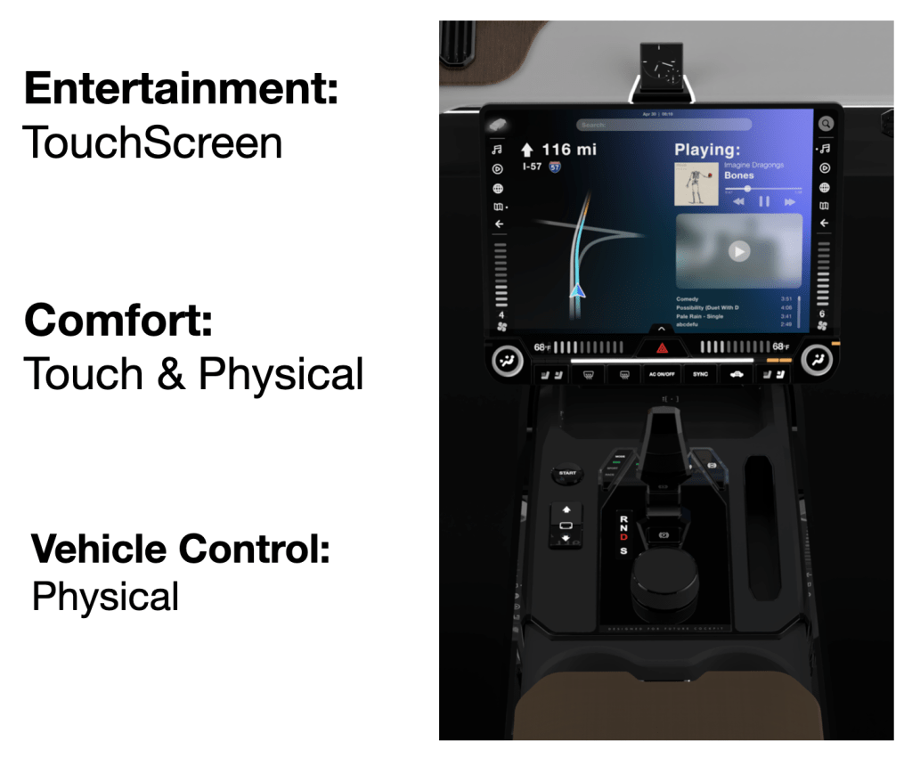 Comfort control is a mix of physical and virtual control. All On-Off input is in the form of buttons, and all adjustable setting, including volume, fan mode, fan power, and temperature is in three distinct interaction ways for the confidence of bind control: