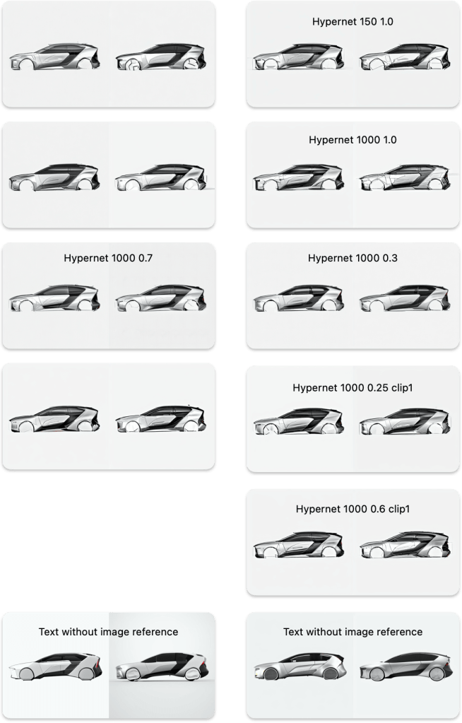 I also tried to train my first ‘add-on’ model (Hypernet) and tested its effects on the output with different steps trained (150 and 1000 in the image, generally it takes about 10000 steps to create a usable model) and weight. By applying appropriate parameters of the AI model and Hypernet, SD creates convincing visualization with detailed shadow and light.