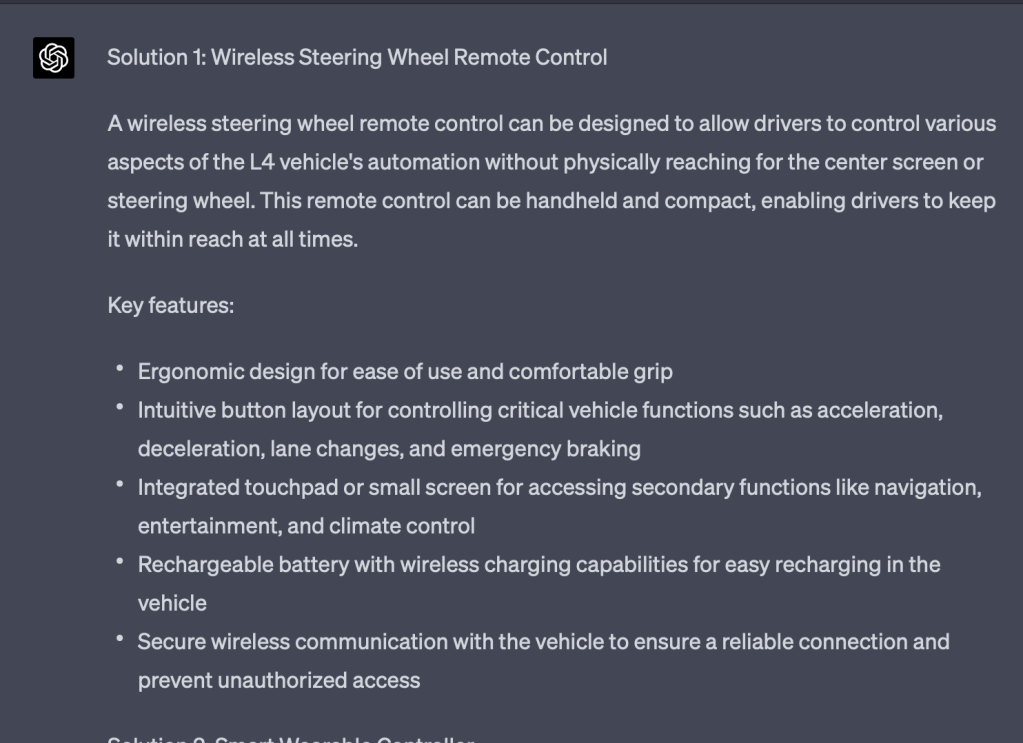 (Apr 14th) I asked GPT4 to propose a design solution to let drivers change vehicle’s automation without touching the steering wheel and the center screen (my thesis project). Here is GPT4’s answer: