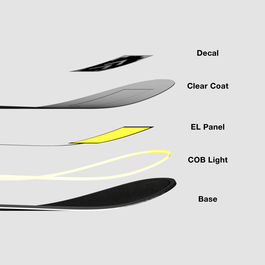 - Decals are affixed to the surface of the board and are lit up by the light that passes through from the EL panel.